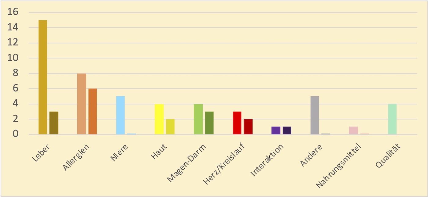 Leberreaktionen als häufigste Nebenwirkung verdienen eine besondere Beachtung. Graphik 2 zeigt eine Aufteilung nach Schweregrad und Wahrscheinlichkeit der Assoziation. Drei Fallmeldungen mit wahrscheinlichem oder sehr wahrscheinlichem Zusammenhang zeigen einen Schweregrad 3 und erforderten eine Krankenhausbehandlung. In drei Fällen konnte ein Zusammenhang mit der chinesischen Arznei definitiv ausgeschlossen werden, darunter ein Fall vom Schweregrad 3.